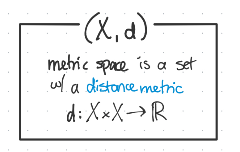 So, the metric space is a set of elements (usually called “points”) which have a distance between any two elements in the set. Precisely, it’s a tuple $(X, d)$ consisting a set $X$ and a distance metric $d$.